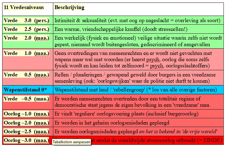 Als algemene uitgangspunt inzake (psychologische) oorlog en vrede, geldt Het Vredesmodel. Daarin wordt een verschil gemaakt tussen twee persoonlijke niveaus en negen maatschappelijke niveaus. Die gelden niet voor een heel land (behalve de wapenstilstand), maar voor (alle mogelijke) situaties binnen een land. Vrede 2.0 staat symbool voor 'vrede in majeur', vrede 1.0 betreft 'vrede in mineur' (bv. een situatie waarin iemand gepest wordt of een hulpverlener wordt aangevallen).