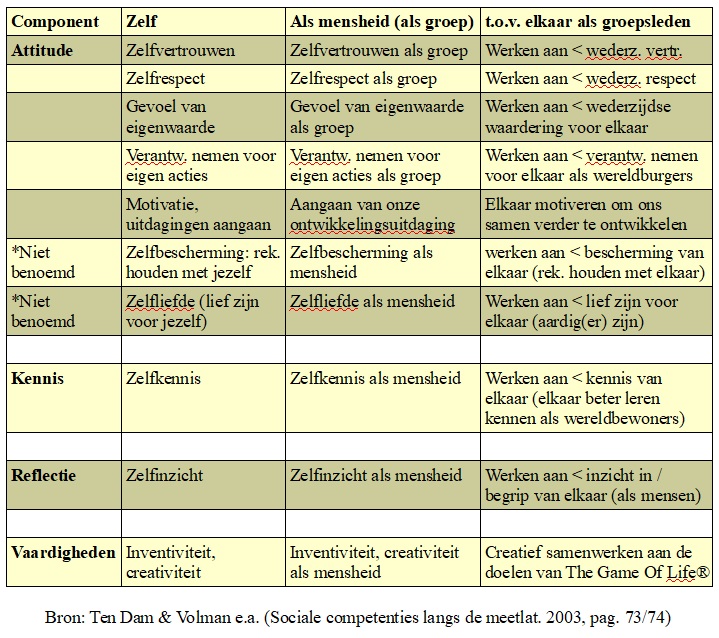 De sociale competenties zijn ingedeeld in vier componenten: attitude, kennis, reflectie en vaardigheden. Er zijn drie categorieën. In de derde categorie is iedere competentie verwerkt tot de gewenste wederzijdse actie: 'werken aan de bevordering / het vergroten van' ( < ).