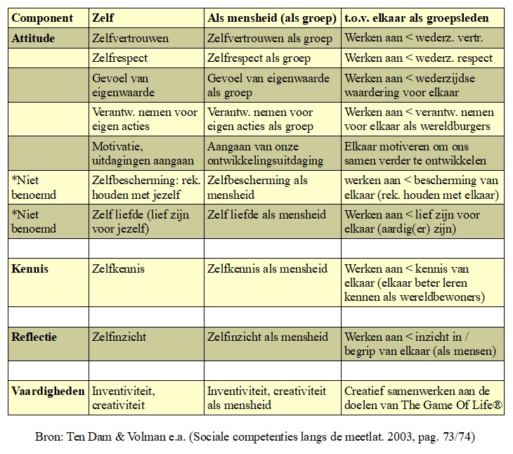 De sociale competenties zijn ingedeeld in vier componenten: attitude, kennis, reflectie en vaardigheden. Er zijn drie categorieën. De eerste gaat over jezelf, dan als mensheid (als groep) en tenslotte ten opzichte van elkaar als groepsleden. In de derde categorie is iedere competentie verwerkt tot de gewenste actie (het doel): 'werken aan de bevordering / het vergroten van' ( < ).