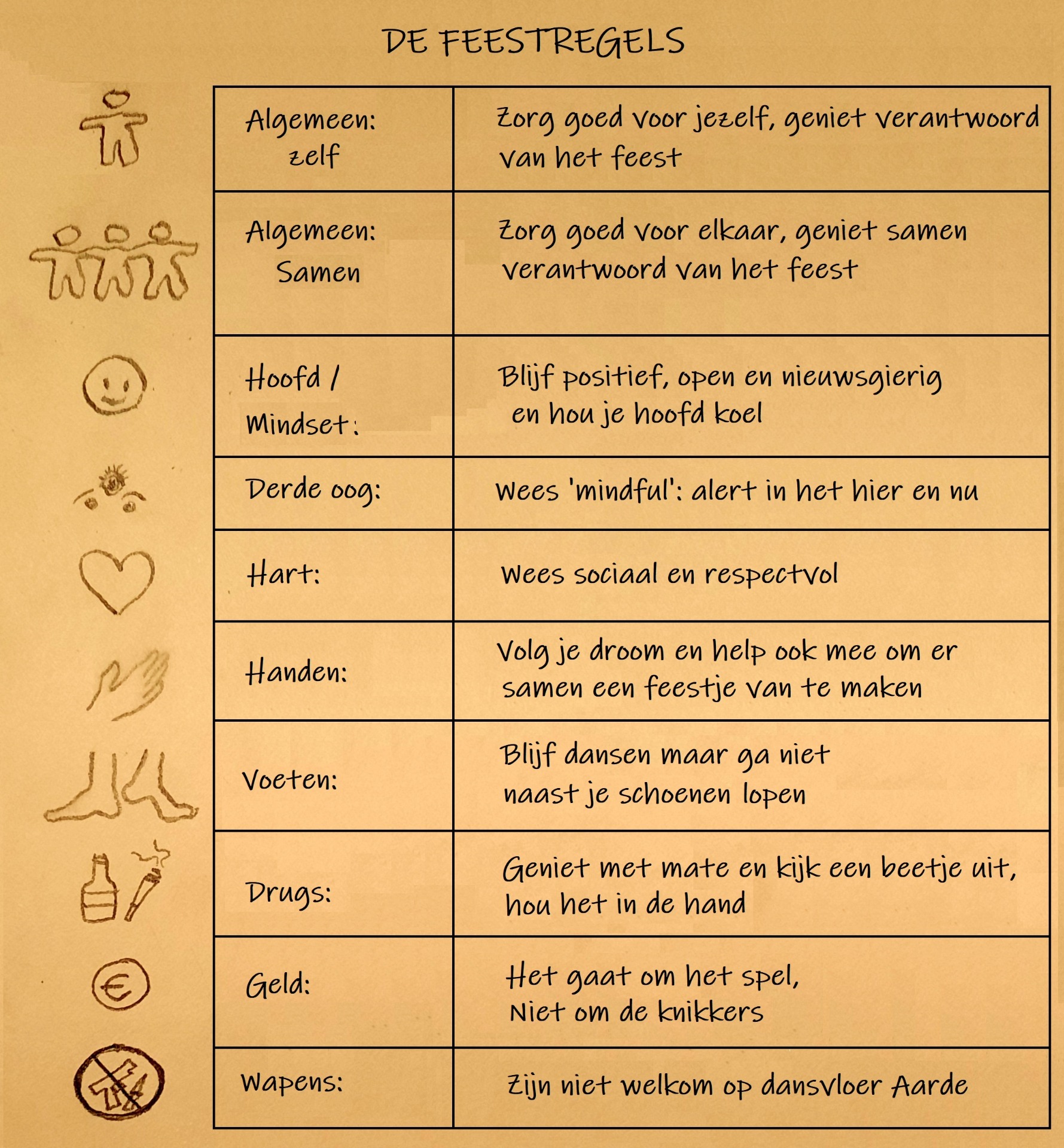 Als Aarde Raad hebben we echter toch ook tien zogenoemde 'Feestregels' samengesteld, op basis van de gedachte dat het leven op Aarde een feestje is - of althans dient te zijn. Deze niet-religieuze feestregels kunnen ons misschien helpen om het allemaal eens te worden over de meest basale omgangsvormen. Ze zijn namelijk wat simpeler gesteld dan ons duidelijk zou moeten worden uit de vele regels van ons wetboek, de bron van de 'spelregels van onze samenleving'. We hebben thans geen 'lijstje' met zeg, tien 'regels of voorschriften voor gedrag' vanuit onze democratische maatschappij, als een maatschappelijke opvolger van de Christelijke tien geboden (die uiteraard weer in ons wetboek zitten verweven), die we allen als burgers met elkaar zouden delen.